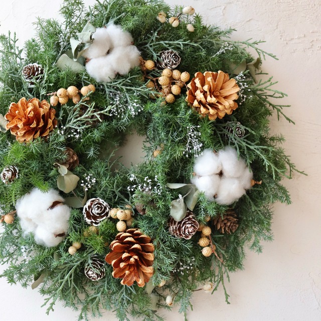 ★ 只今の納期11月末頃になります。 香りも楽しめるフレッシュリース2025 毎年たくさんお作りさせて頂く、当店一番人気のクリスマスリース・:* 針葉樹(コニファー)とユーカリの、フレッシュで爽やかな香りをお楽しみください。 温かみのある素朴な雰囲気のリースは、派手さもなく気取らず、場所を選びません・:* 飾っておくだけで、徐々にドライフラワーへと変化していきます。針葉樹は持ちが良く、ドライフラワーリースとしても長くお飾り頂けます。 ➤ ギフトラッピングは対応しておりません 生花や半ドライの状態の花材が多い(水分を含んでいる)ため、セロハンでお包みすると内側に水滴が付着してしまいます。また、湿気により植物の状態も悪くなってしまいます。そのためラッピングには対応しておりませんが、ギフト直送は可能になります。(密閉せずにクラフト紙などで梱包、メッセージカード対応可) 備考欄にてご用途やメッセージご希望などお知らせください。 ➤ 制作工程の中でグルーガンを使用しています。 ➤ お花の取扱説明書付き(当店オリジナル) ドライフラワーの取り扱い方法がわからない場合でもご安心ください。 ➤ 使用花材や木の実は、在庫状況やメーカー生産終了等のため類似材料に変更になる場合があります。アレンジの雰囲気は変えず素敵に仕上げますので、ご安心ください! ┄┄┄┄┄┄┄┄┄┄┄┄┄┄┄┄┄┄┄┄ ▪︎ size H30cm、W28cm It is approximately the size. (おおよそのサイズです) クリスマスリース クリスマス飾り クリスマスインテリア クリスマスディスプレイ フレッシュリース ドライフラワーリース ドライになるリース クリスマスの定番リース シンプル 壁掛け 店舗ディスプレイ サロンインテリア 店舗装飾 木の実 良い香り Christmas wreath Xmas