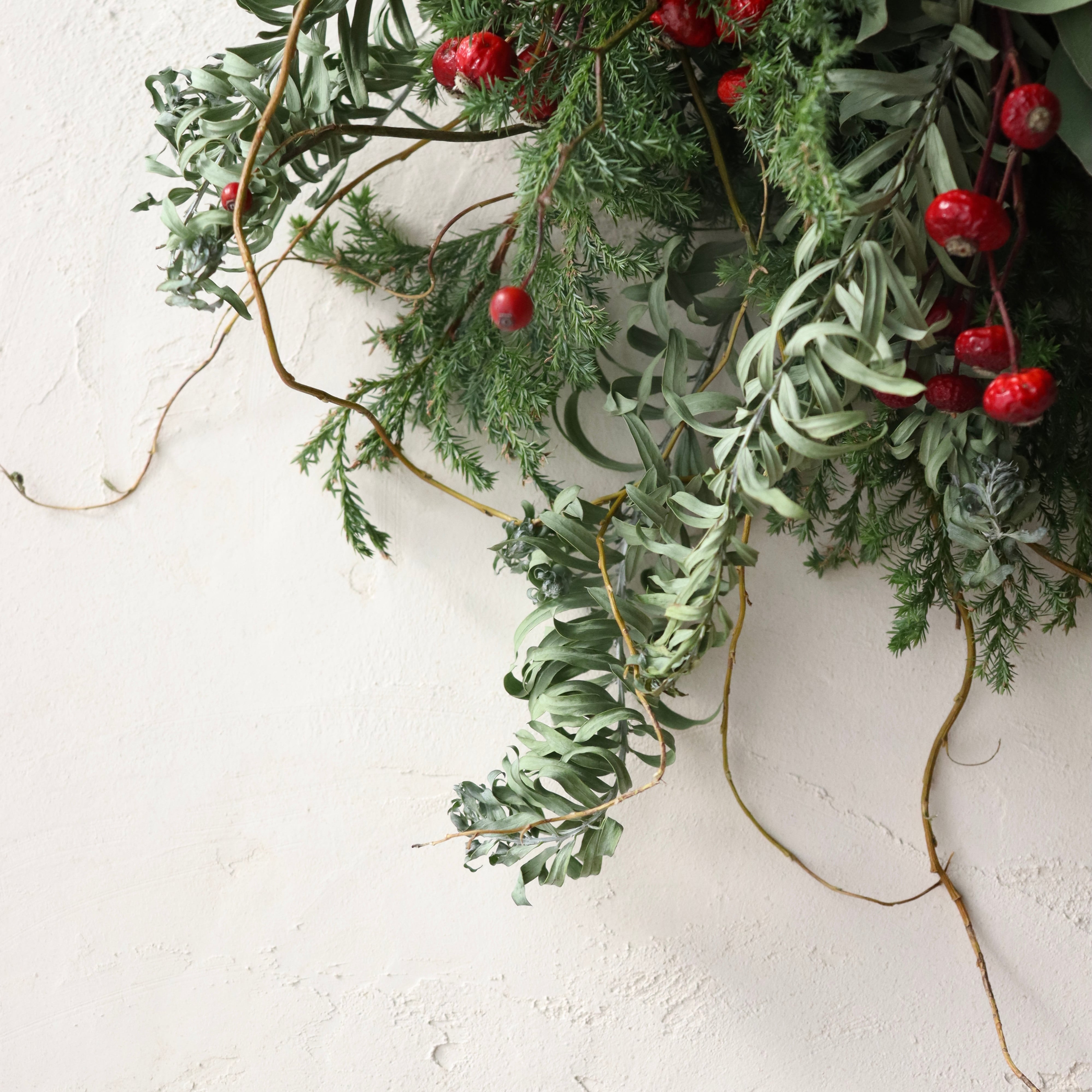 数種類のグリーンと2種類の赤い実、そして動きのある柳をシンプルに束ねたスワッグです。