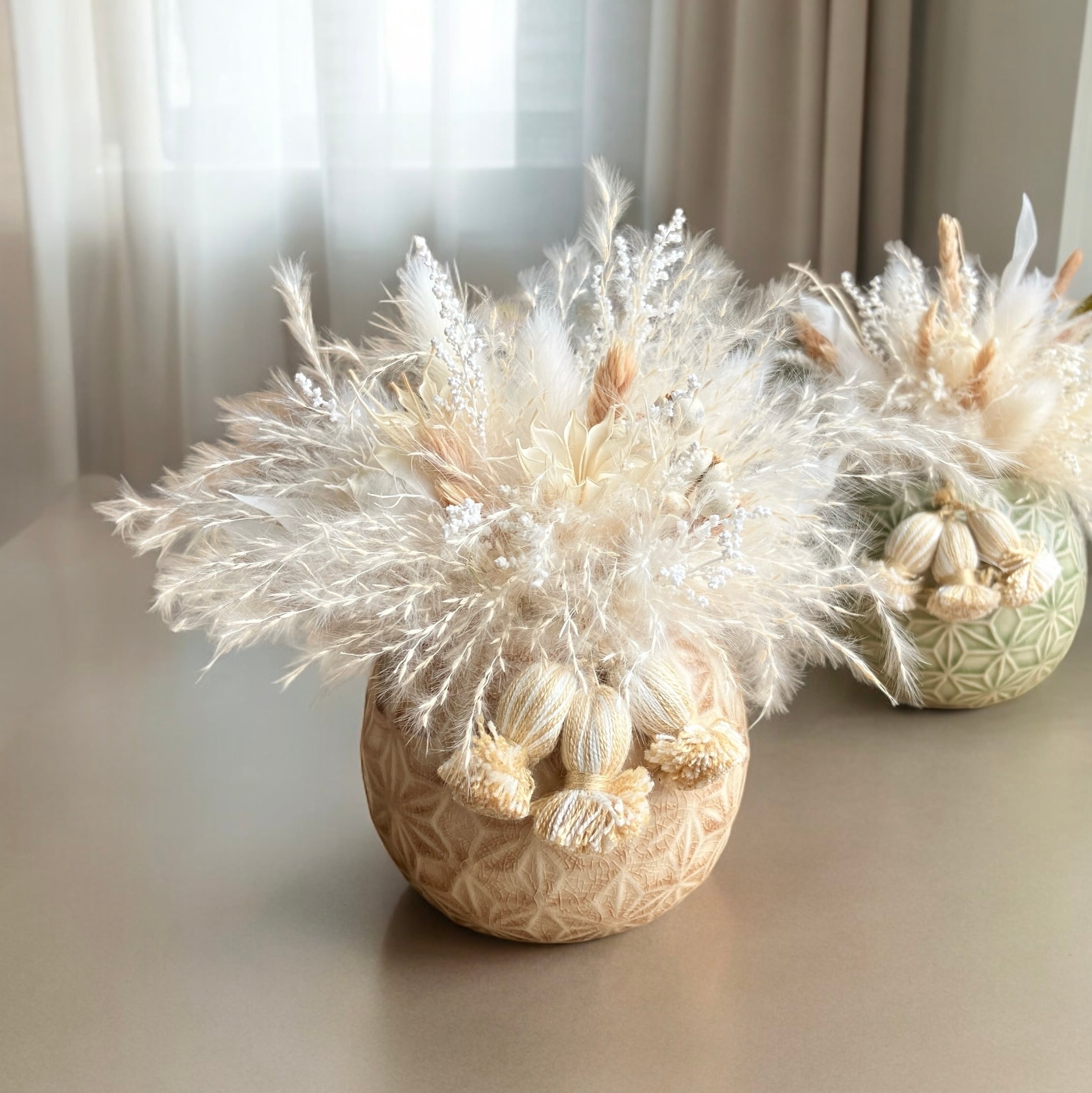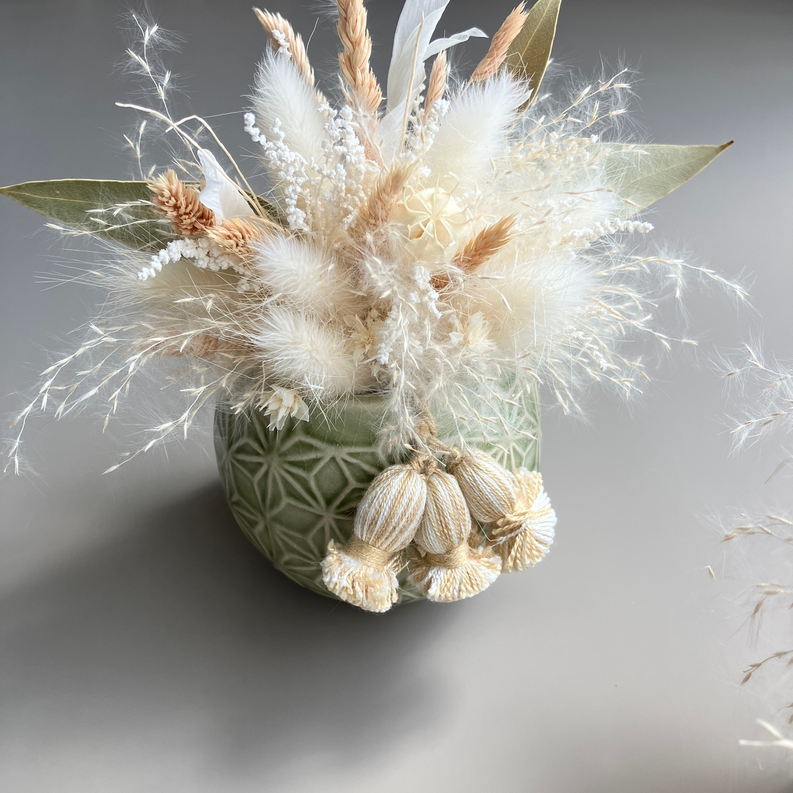 ふわふわドライフラワーの和風アレンジメント。ちいさなベージュの3連タッセルが可愛いアクセントになっています・:*